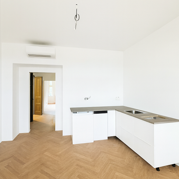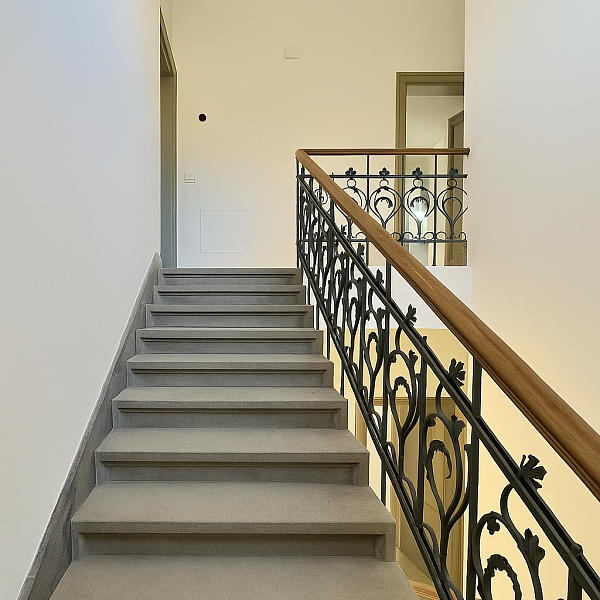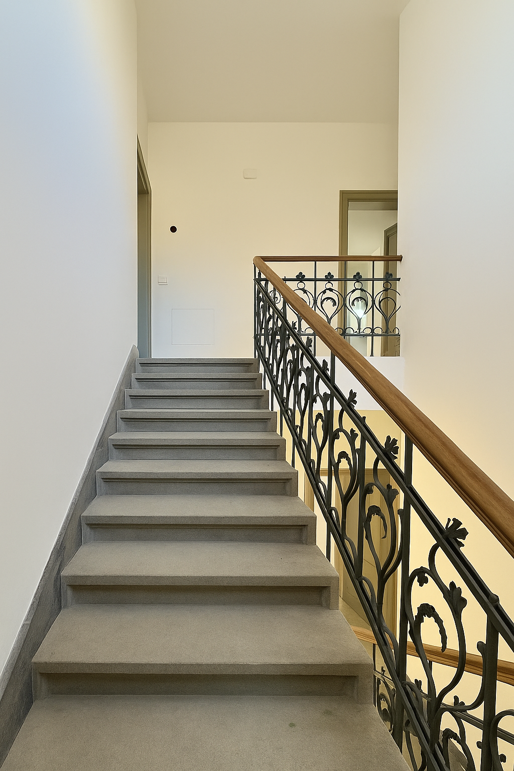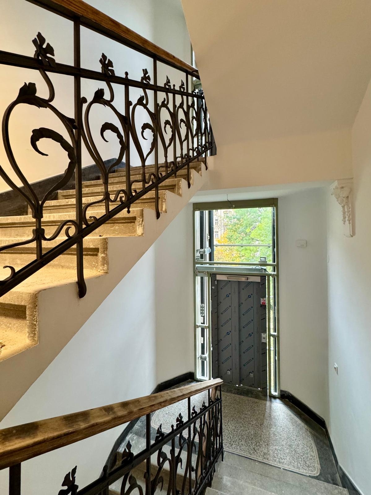 The apartment building on Kodaňská was built around 1890, designed as a brick triple-bay structure, with one underground and five above-ground floors, and an unused attic where 3 new residential units have been constructed. The project will be ready for move-in in autumn 2025. At present, the project is in the more advanced stages of reconstruction, during which the existing layouts have been modified and new apartments have been built into the attic space. The roof reconstruction has been completed, windows have been replaced, new balconies and terraces have been built on the courtyard façade of the building. A new elevator has been installed, along with new electrical wiring and heating systems, and the reconstruction of windows and doors has been completed. The façade of the building has been repaired on both sides.