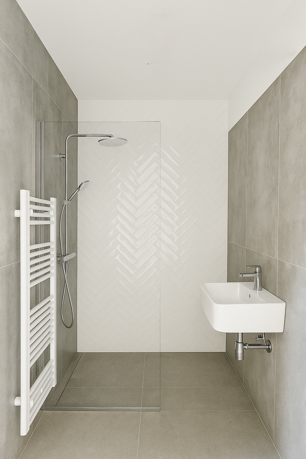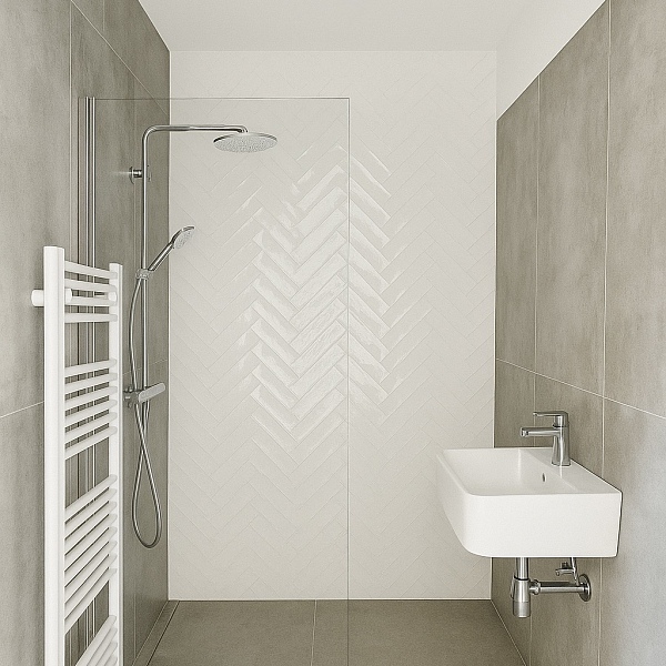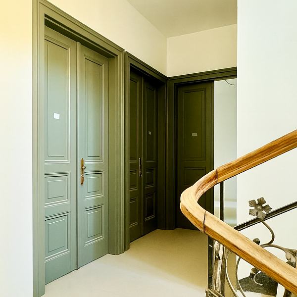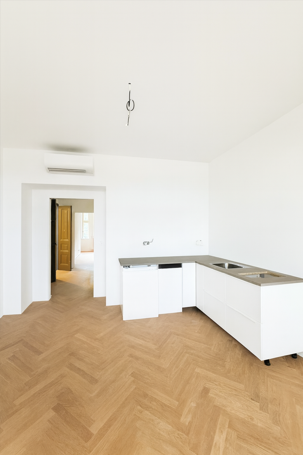 The interiors of the apartments are inspired by Copenhagen (Danish) design, which falls under the Scandi style – that is, Scandinavian minimalism. The units are renovated to a high standard; we have used light, warm shades and added an accent to the carpentry elements in a grey-green color (the color of the stormy North and Baltic Seas). The floors feature natural materials – oak parquet laid in a herringbone pattern, combined with large-format tiles imitating concrete. The same laying pattern is also used for white tiles in the bathrooms. White simply cannot be omitted from Scandinavian style and First Republic architecture.