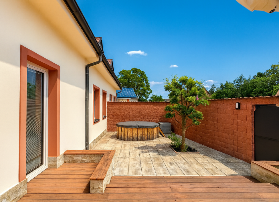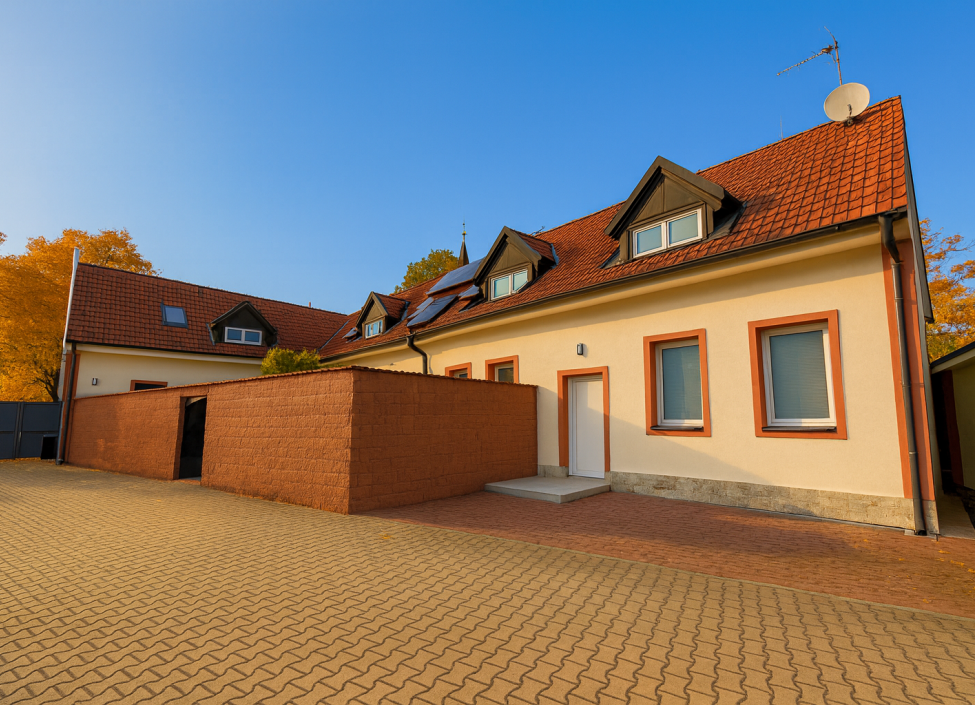 Obytná část budovy má 192 m² a současná dispozice je 4+1. Může sloužit jako pohodlné bydlení, ale stejně tak i jako kanceláře, klientské prostory nebo samostatné ubytování. Vše se nachází v příjemném, uzavřeném prostředí, kde nechybí soukromá část s terasou, vířivkou, zelení a technickým zázemím. Vytápění zajišťuje tepelné čerpadlo a solární panely, alternativou je elektrokotel a klimatizace. Dům je připojen na obecní vodu a kanalizaci, ale k dispozici jsou i dvě vlastní studny pro užitkovou vodu, zavlažování a údržbu. Samostatné měření energií a důraz na úsporný provoz jsou samozřejmostí.
