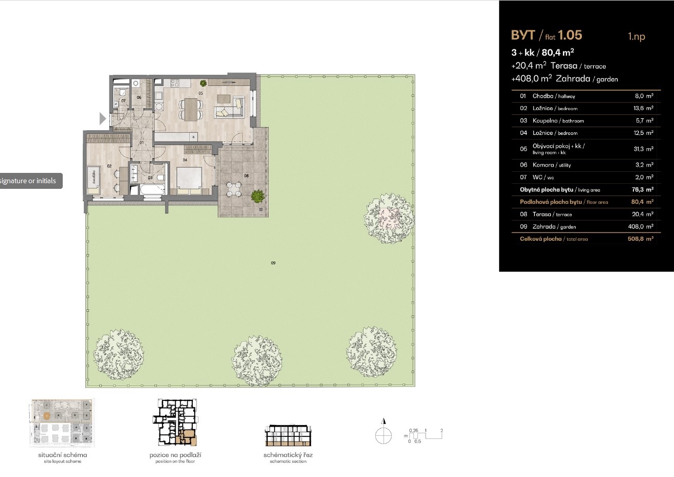 Nabízíme prostorný a světlý byt 3+kk o velikosti 80,4 m² se zahradou (480 m2) a terasou (20,4 m2), který se nachází v moderním bytovém viladomu se soukromým vnitroblokem v atraktivní lokalitě Prahy – Dolních Chabrech. Byt je součástí komorního projektu s důrazem na klid, bezpečí a dostatek soukromí.