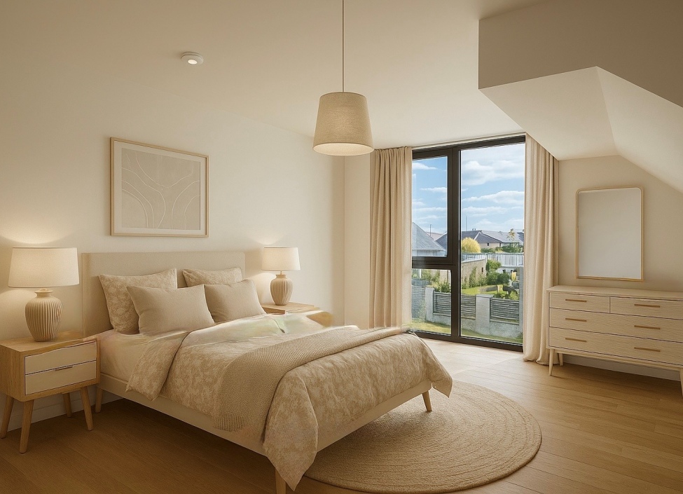 V přízemí na vás čeká prostorný obývací pokoj s přímým vstupem na terasu a do zahrady, kuchyňský kout s jídelnou, šatna, technická místnost a samostatné WC. V patře vás přivítá soukromá zóna: hlavní ložnice s vlastní koupelnou a saunou, dvě další ložnice – každá se šatnou – pracovna či další pokoj a druhá koupelna.