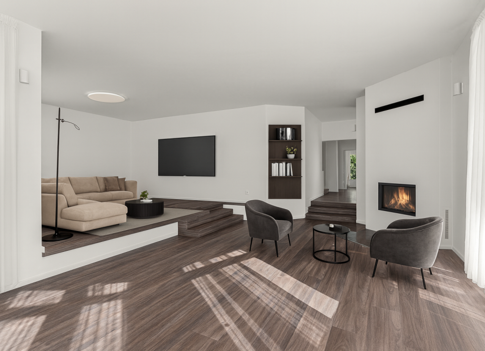 V přízemí se nachází prostorný obývací pokoj s krbem, který nabízí místo nejen pro relaxaci, ale i zábavu – například domácí kino, kulečník nebo klidovou zónu. Je zde možné vytvořit i další oddělenou místnost dle potřeby. Kuchyně navazuje na jídelní prostor, ve kterém je dostatek místa pro společné rodinné chvíle. V tomto podlaží se nachází i pokoj pro hosty, koupelna, samostatné WC, šatna a další praktické prostory.