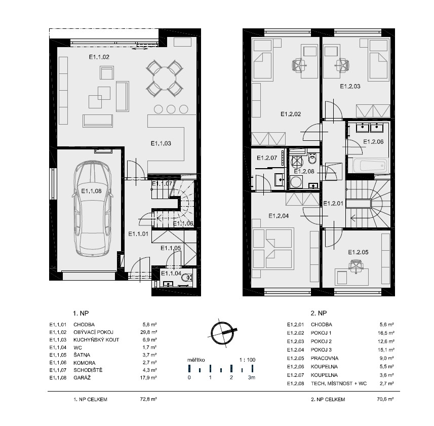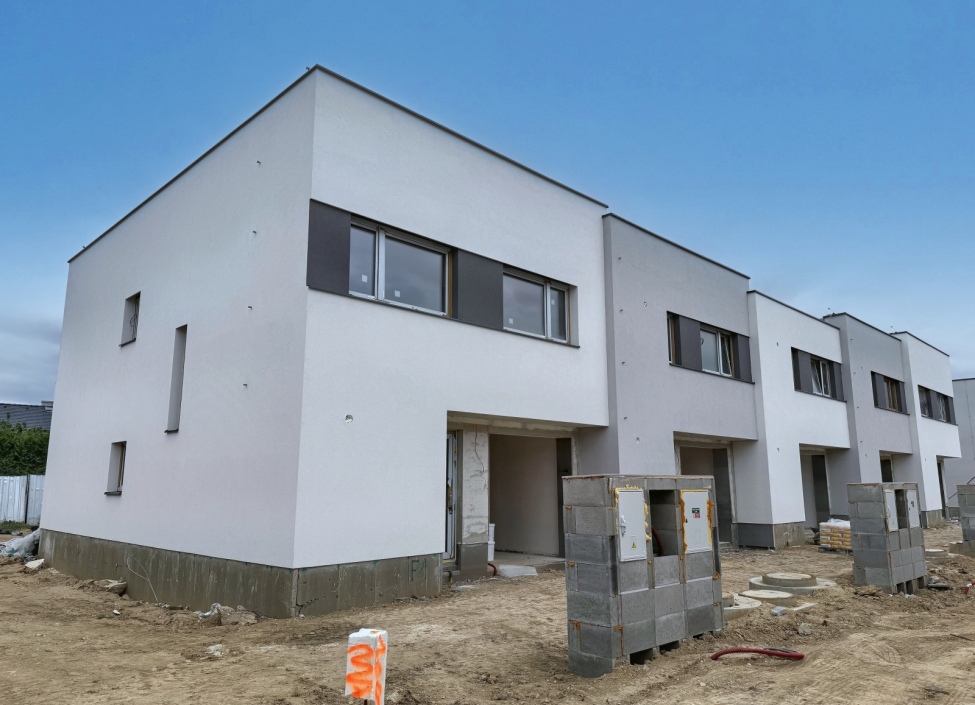 Rodinné domy budou založeny na betonových základových pasech podle projektové dokumentace. Objekt je konstrukčně navržen jako zděný stěnový systém. Obvodové stěny v provedení z keramických tvárnic Porotherm. Vytápění bude plynovým kotlem a řešeno podlahovým rozvodem topení, v koupelnách sušený otopným žebříkem s el. ohřevem. Každému domu náleží garážové stání.