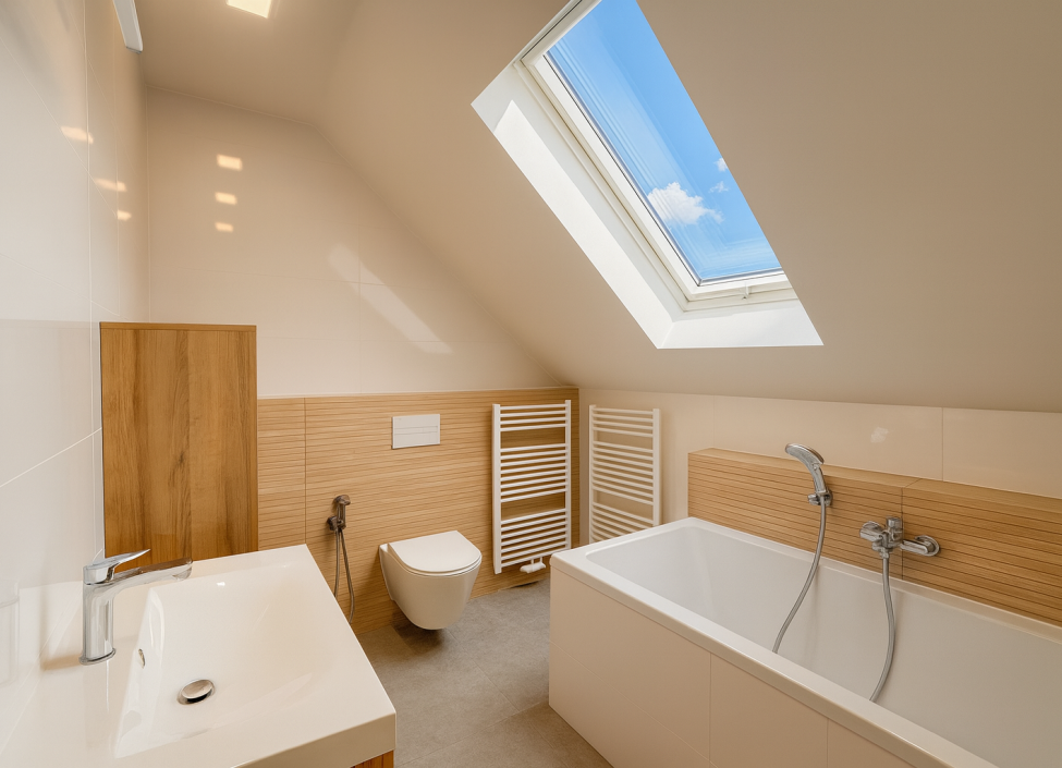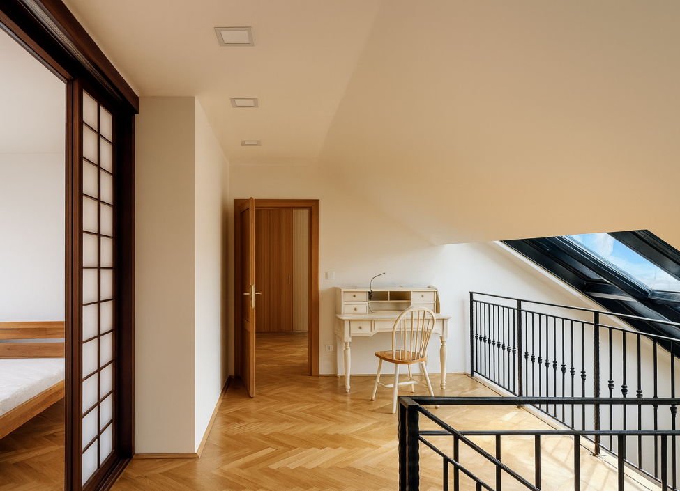 Ve spodním patře se nachází vzdušný a prosvětlený obytný prostor, který plynule propojuje obývací pokoj s jídelnou a plně vybavenou moderní kuchyní, jejíž součástí jsou veškeré spotřebiče včetně myčky, elektrické varné desky či vestavěné trouby. V této části bytu dále naleznete technickou místnost s pračkou a šatnu/komoru, která poskytuje dostatek úložného prostoru. Nechybí ani samostatná toaleta s bidetem. V celém bytě jsou nová střešní okna.