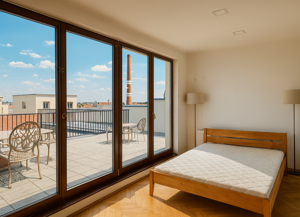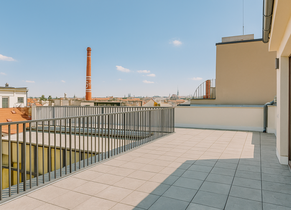 Dominantou celého bytu je terasa o rozloze 56 m², která poskytuje ideální prostor pro odpočinek po náročném dni, ranní kávu s výhledem na město nebo večerní posezení s přáteli a rodinou při západu slunce.
