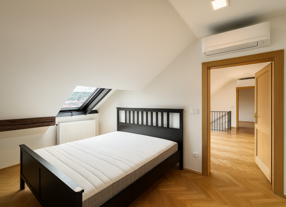 V horním podlaží naleznete tři ložnice: menší ložnici s vestavěnou skříní, hlavní ložnici s vlastní koupelnou a přímým vstupem na prostornou terasu s výhledem na hrad a Petřínskou věž a třetí ložnici také se svou koupelnou se sprchovým koutem a wc. Koupelny jsou plně zrekonstruované.